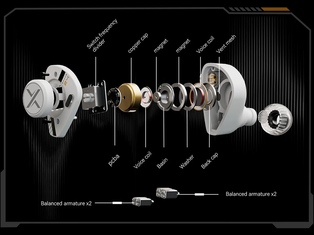 「ooopusX Op.24」のドライバー構成は、同軸配置の10mm+8mmダイナミックドライバーと4基のバランスド・アーマチュア(BA)ドライバーによる3Wayハイブリッド構成を採用。ダイナミックドライバー部は低域用の10mmドライバーと、高域のインピーダンスを最適化する8mmドライバーを同軸配置することで構成。BA部は2種類の2BAユニットで構成され、それぞれ中高域と超高域を補完します。