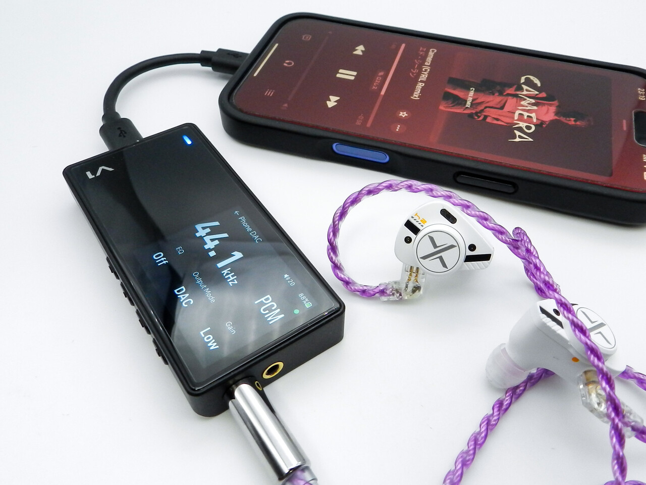 ということで、コンパクトながら非常に多機能を実装した「TempoTec Variations V1」ですが、音質傾向はデュアル「CS43131」の傾向を反映した非常に素直でニュートラルな印象の音で再生されます。同様のDACチップを搭載した低価格なドングル型オーディオアダプターと比較して味付けなどは無くバランス良く鳴る印象。これは多くのドングルが他製品がスマートフォンからの給電による限られた消費電力で出力を確保するため、よりメリハリを感じやすいチューニングを行う傾向にあるのに対し、自身でバッテリーを持ちコンパクトながら強力な出力を実現した「TempoTec Variations V1」ではそのようなアプローチを行う必要が無く、よりニュートラルバランスのサウンドを実現できているといえるでしょう。また「CS43131」の特徴がより反映されており、ESS系DACと比較し、より自然な色づけでやや丸みのある滑らかな印象があります。いっぽうでノイズ特性は非常に高く、敏感なIEM製品でも透明度の高いサウンドを実現しています。またLow/Highの2種類のゲインによりシングルエンドで最大123mW×2、バランスで215mW×2の出力により多くのイヤホン、ヘッドホンで安定して駆動させることが可能で音場感も確保されます。ただし、さらに高インピーダンスのヘッドホンの場合、音量を上げると低音域がやや軽くなるため、この辺はアンプやサイズ感とのトレードオフと言えるでしょう。それでも一般的なニーズには十分に対応しており、またラインアウトやSPDIF出力も可能なため、必要に応じて外部アンプを組み合わせるのも良いでしょう。