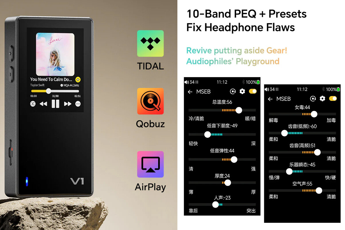 また「TempoTec Variations V1」のOSは独自仕様でHiBy系OSを搭載。DAPとしてのローカル再生のほか、スマホおよびPC向けのUSB-DAC、さらにBluetooth ワイヤレスアンプ(受信/送信の双方向)のモードを搭載します。BluetoothではLDACコーデック(最大96kHz)に対応。さらにWi-Fi機能を搭載し、AirPlay/DLNA/HiByLinkの各種連携、TIDAL/Qobuzのネイティブ再生に対応します。またゲイン切替、デジタルフィルタに加え、10バンドEQ、HiBy MSEBにも対応します。そして1400mAhのバッテリーを搭載し、最大約10時間前後の再生が可能です。