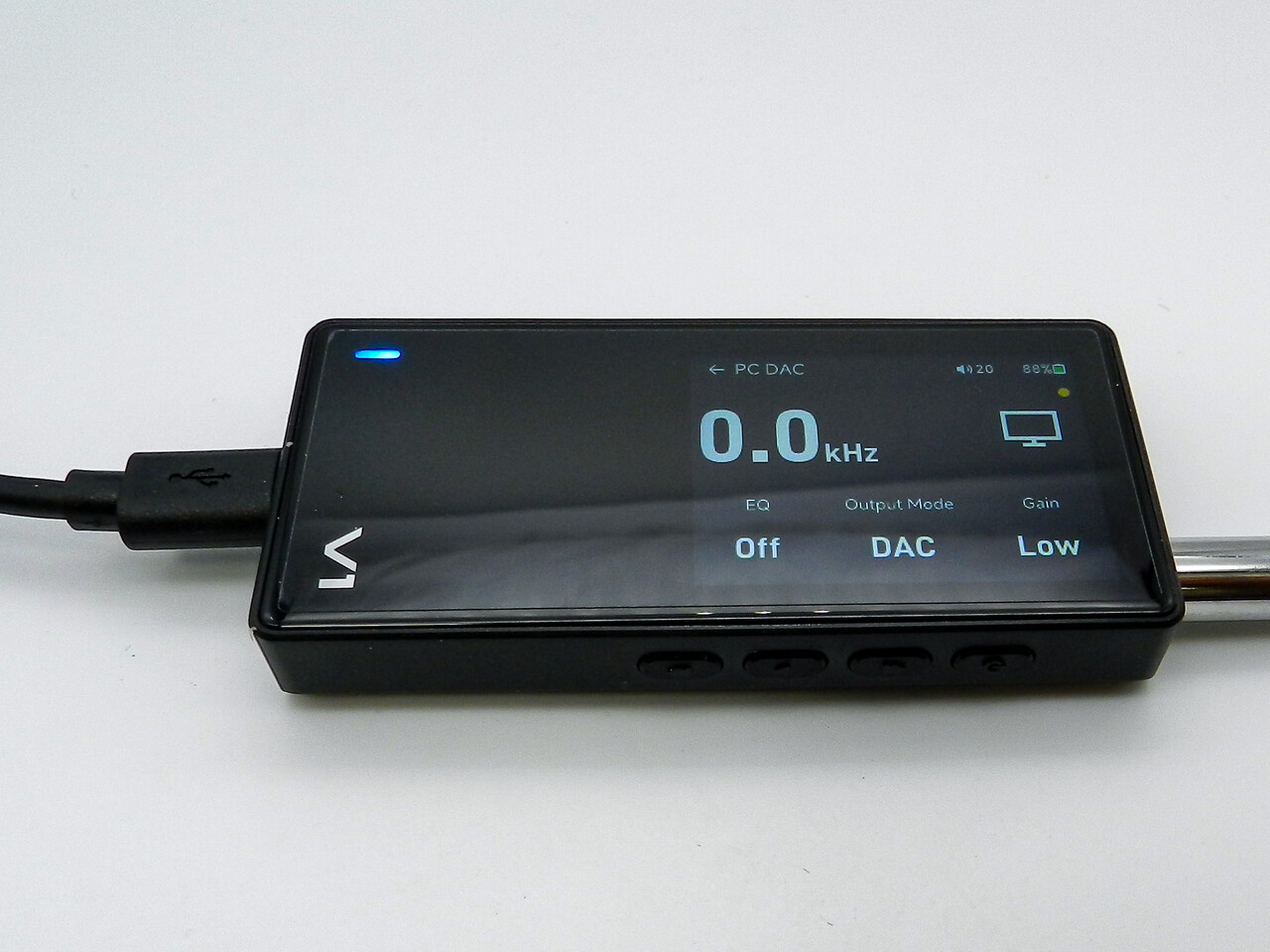 「Phone DAC」「PC DAC」モードでは現在のステータスを表示する画面が表示され、サンプリングレート、EQおよびモード、DACモード、ゲイン設定などがディスプレイされます。このステータス画面だけでも「TempoTec Variations V1」が魅力的に感じる方も結構いらっしゃるのでは、と思うほどクールな印象です。