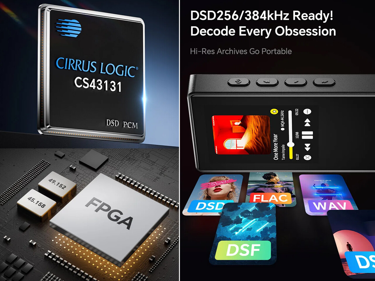 「TempoTec Variations V1」はDACチップはCirrus Logic製「CS43131」をデュアル構成で搭載。PCM 最大2TBに対応したmicroSD(TF)スロットを搭載し、各フォーマットにて384kHz/32bit/DSD256のハイレゾ・ネイティブ再生に対応します。