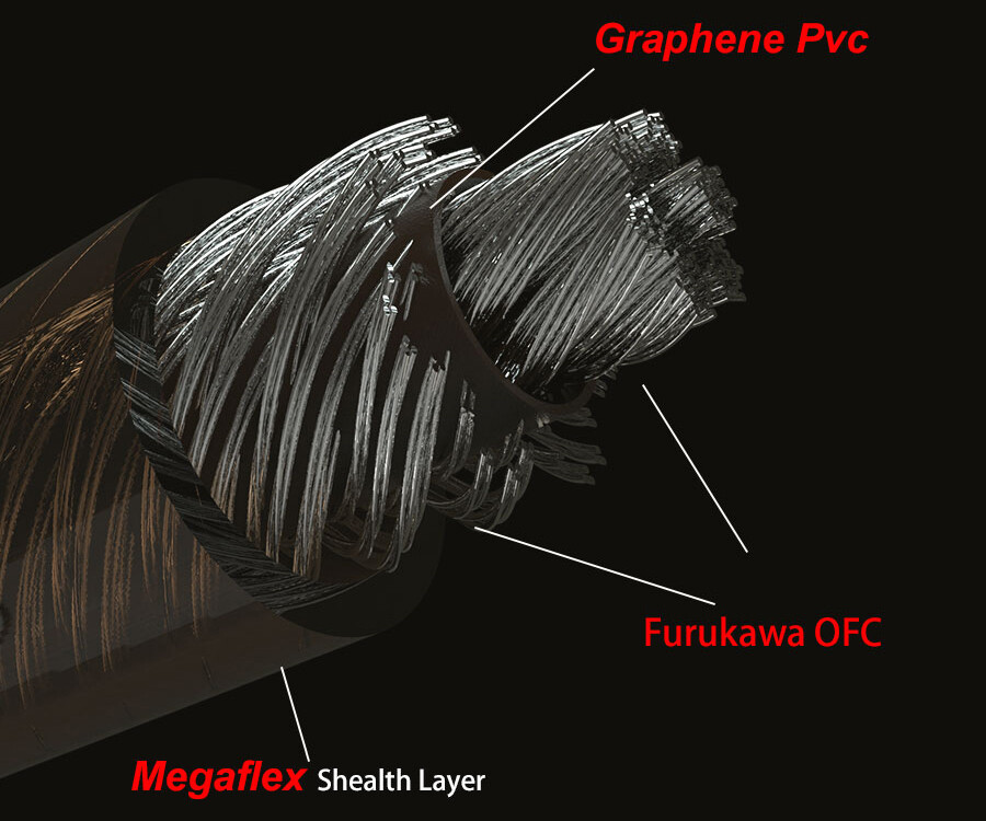 樹脂被膜からはグラフェンシールドの外周を覆う古河電工製OFC導体が透けて見える線材。Megaflex被膜は適度な弾力があり取り回しの良さを確保しています。また三角形の切り込みの入った金属部品は独特の雰囲気と質感がありますね。