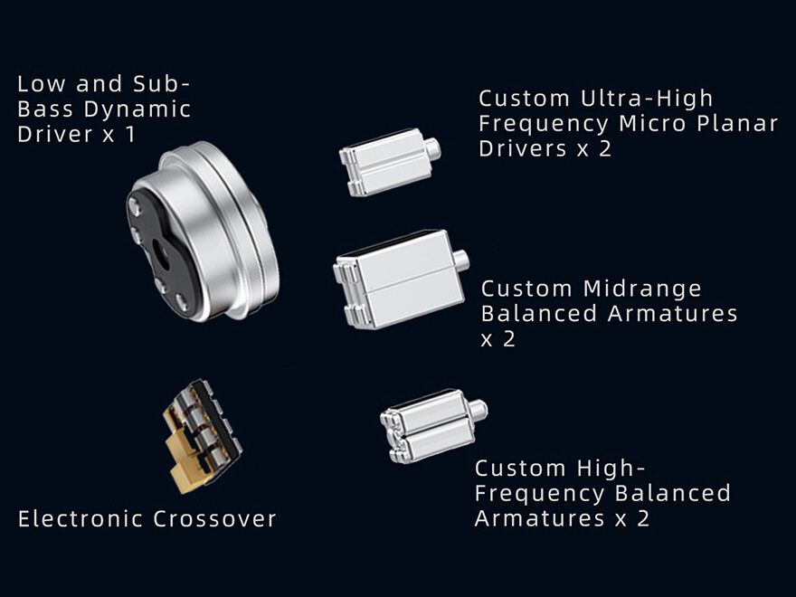 「DUNU DN142」のドライバーは低域用の10mmダイナミックドライバー、中音域用のカスタムデュアルBA、高域用のカスタムデュアルBAによる4基のバランスド・アーマチュア(BA)ドライバー、そして超高域用の2基のマイクロ平面ドライバーによる1DD+4BA+2Planar構成を採用。これらのドライバーを精密に設計されたクロスオーバーネットワークにより自然に融合します。