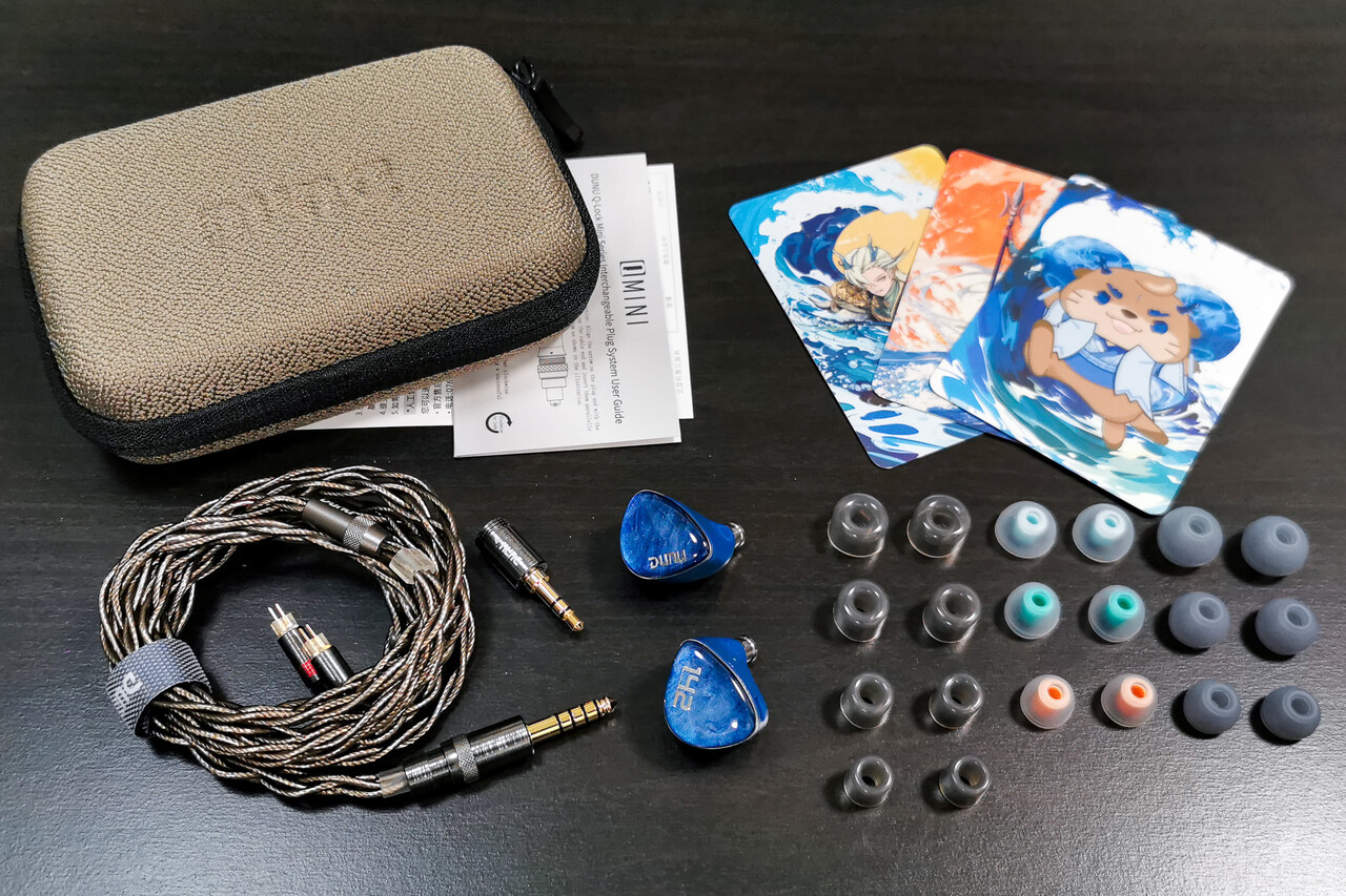 ケーブルにはリッツ線構造の高純度銀メッキ単結晶銅の4芯ケーブルを付属。0.78mm 2Pinコネクタを採用し、DUNU独自の「Q-Lock Mini」着脱式プラグにより3.5mmと4.4mmプラグを同梱します。イヤーピースには標準のバランスイヤーピースのほか、「S&S Eartips」および「Candy Eartips」を各サイズ付属します。