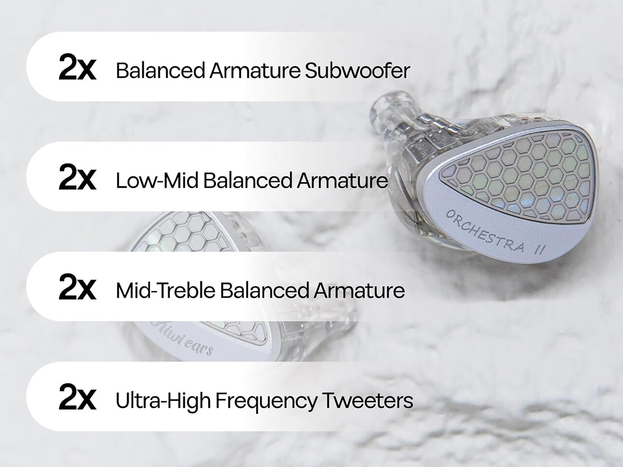 今回の「Kiwi Ears Orchestra II」はKiwi Earsの最初のモデルである「Orchestra」の後継で片側10BA構成のモデル。私のブログでは「Orchestra」系では人気モデルのひとつ「Orchestra Lite」を紹介しています。「Kiwi Ears Orchestra II」では 10 個のBAドライバーにより卓越したオーディオの明瞭性、豊かな中音域、インパクトのある低音域を実現し、スタジオ品質のサウンドを求めるニーズに対応します。