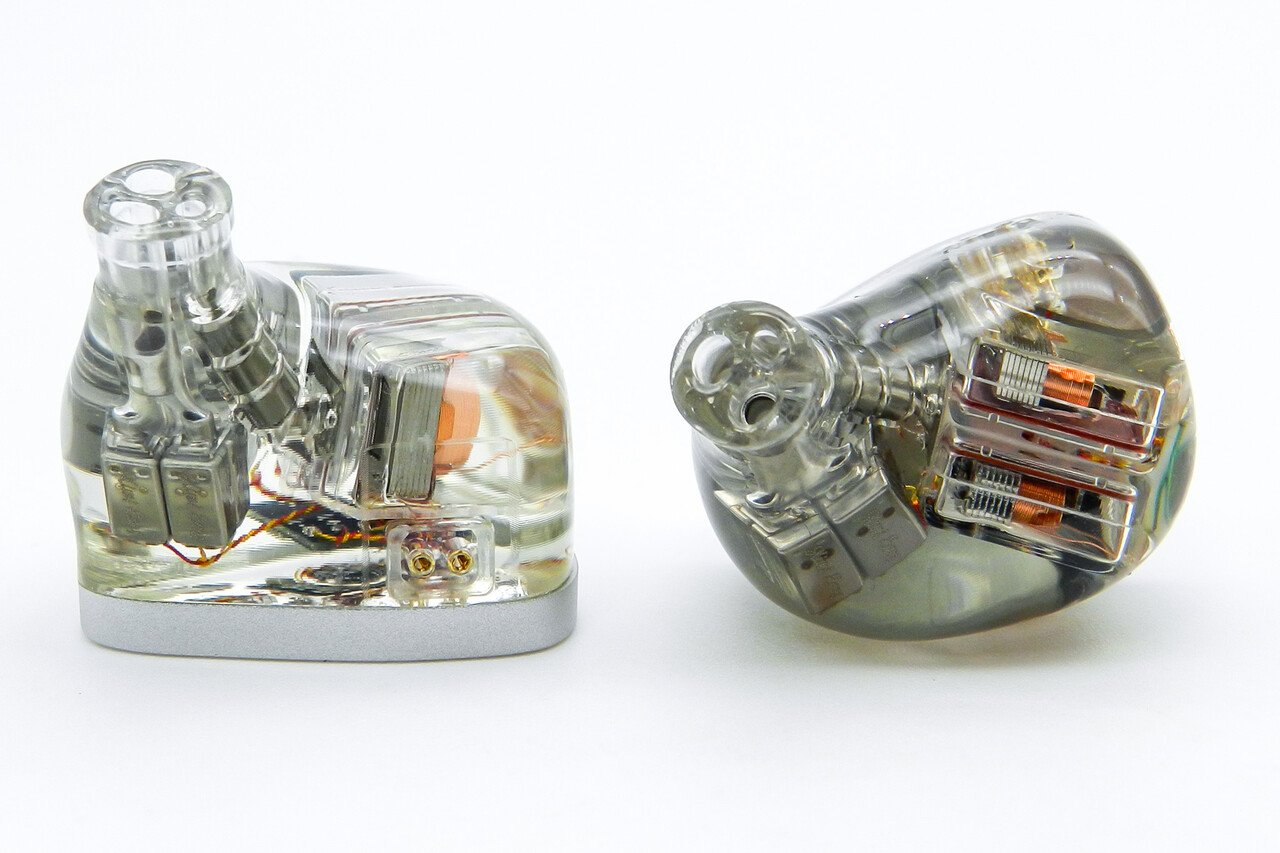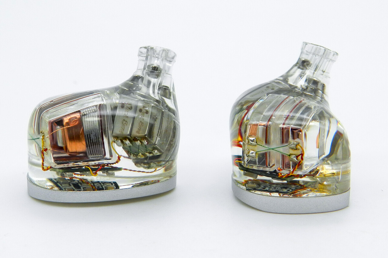透明なシェルをみると各BAユニットの音導管にダンパー等のフィルターがあり、物理クロスオーバー仕様であることが確認出来ますが、実際インピーダンス15Ω、感度110dB/mWとCIEM並みに敏感で電流量の多い仕様となっています。そのため、音量自体は取りやすいですが、低ノイズかつ左右で20基のBAを安定稼働できるしっかりとした駆動力のあるDAPまたはアンプの利用が望ましいでしょう。