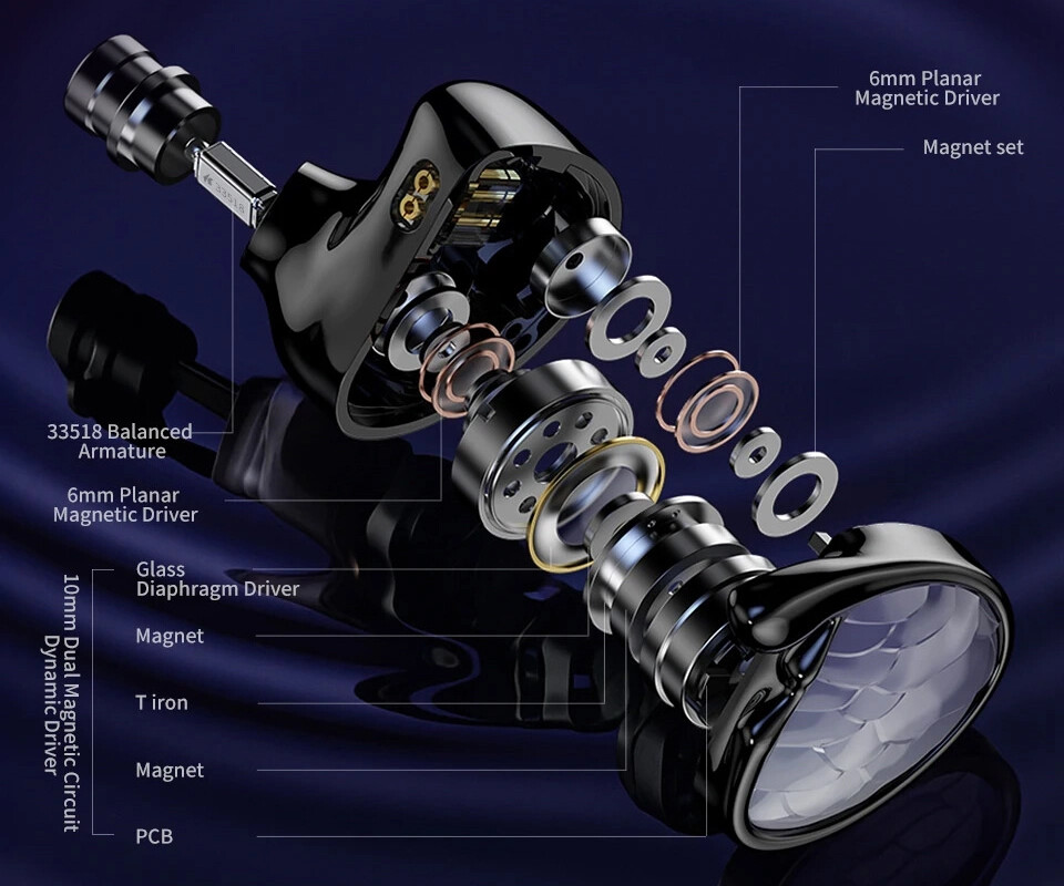 「TRN Mermaid」のドライバーには、10mmダイナミックドライバー1基、BAドライバー1基、そして6mmの平面磁界ドライバー2基を搭載したハイブリッド(トライブリッド)構成を採用。