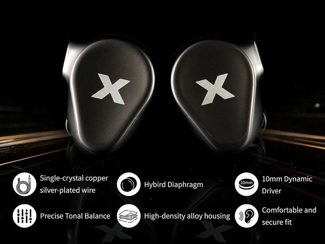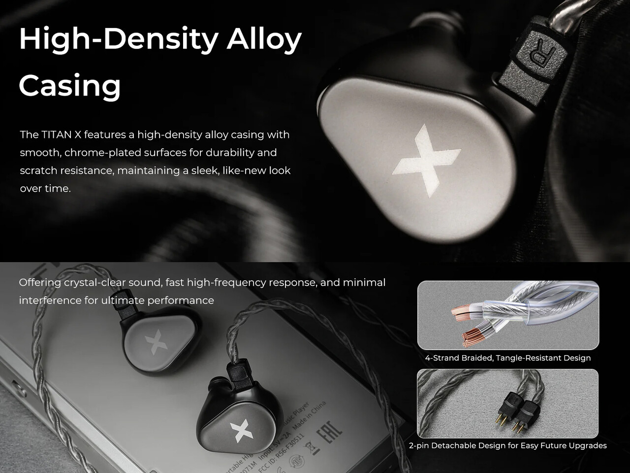 本体は高密度金属合金で成形され、滑らかなクロームメッキ処理で仕上げられています。堅牢性と優れた耐傷性を備えており、質の高い外観と音波共鳴も制御する効果ももたらします。ケーブルは高純度OCC銀メッキ銅4芯ケーブルを採用。3.5mm版 と USB Type-C(DSP+マイク内蔵)版を用意しています。